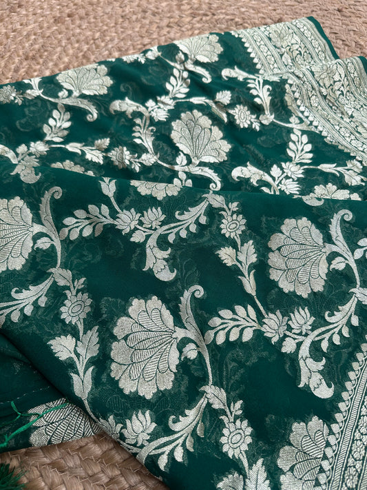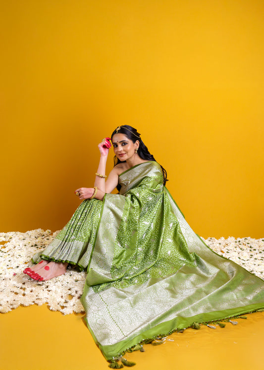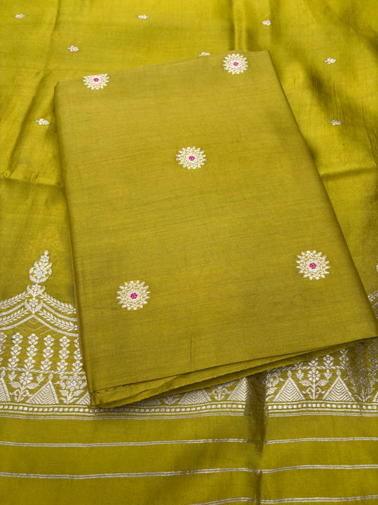 Green chiniya silk kurta, kora shaded dupatta, plain bottom.