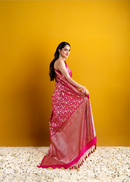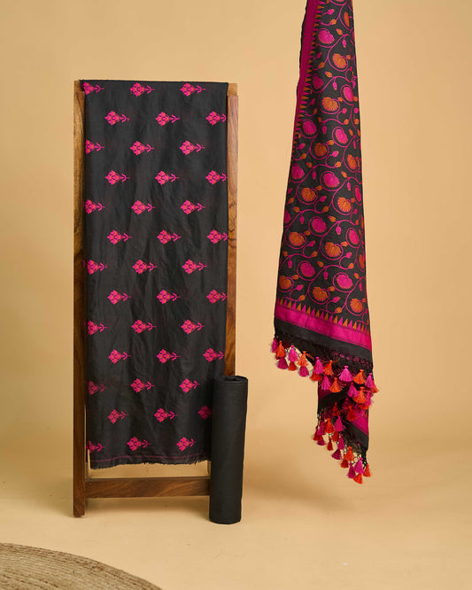 Black chanderi with pink meenadar bootis, jaal dupatta, plain bottom.