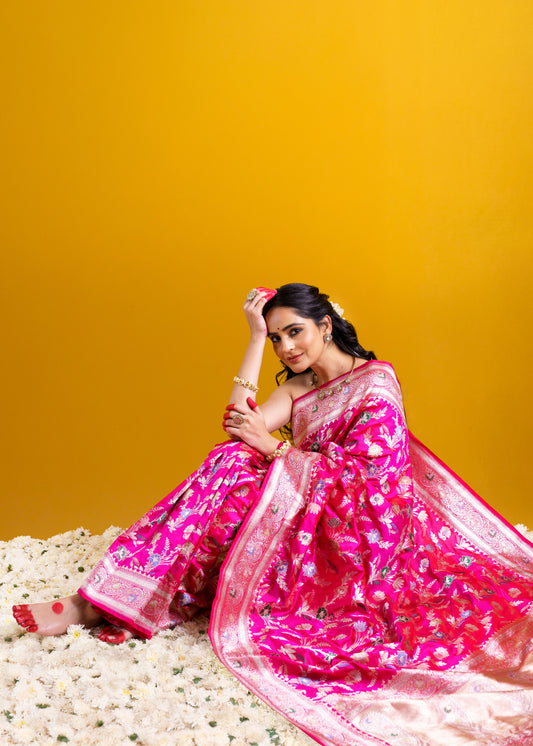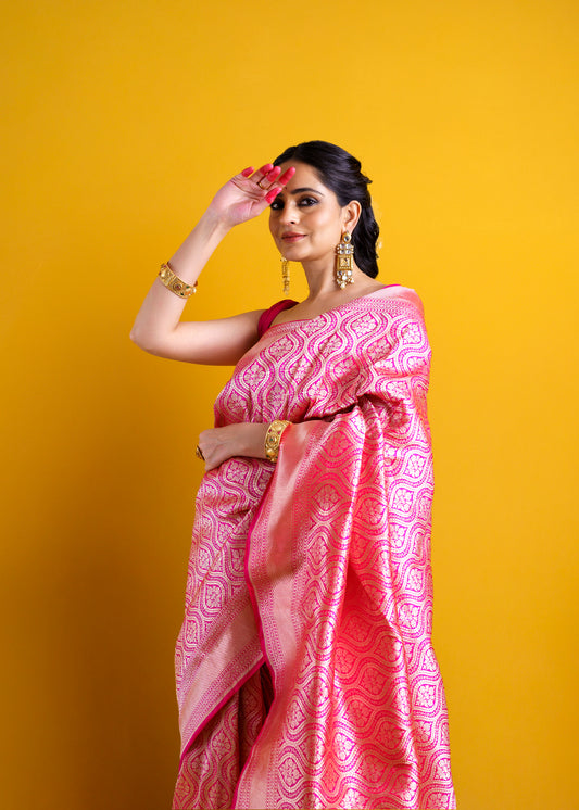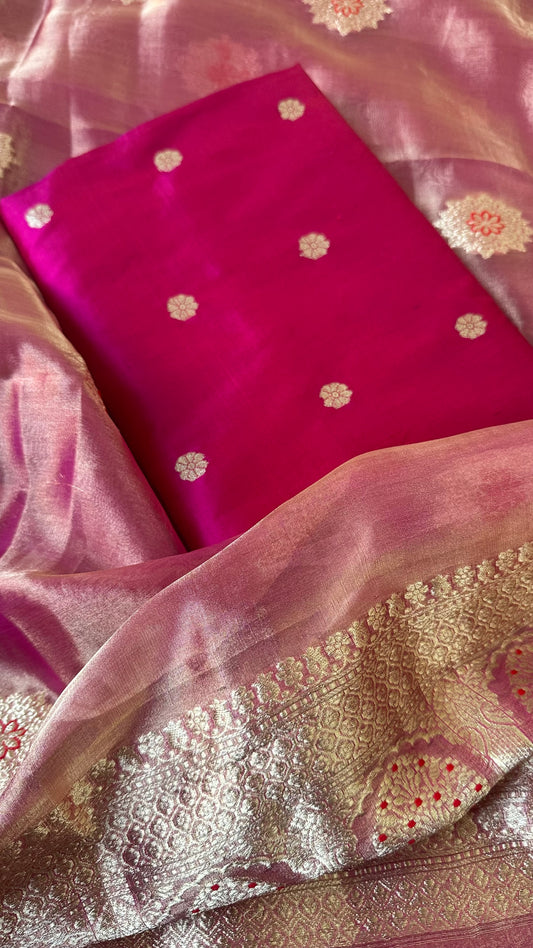 Pink katan silk kurta, tissue meendar dupatta, plain silk bottom.