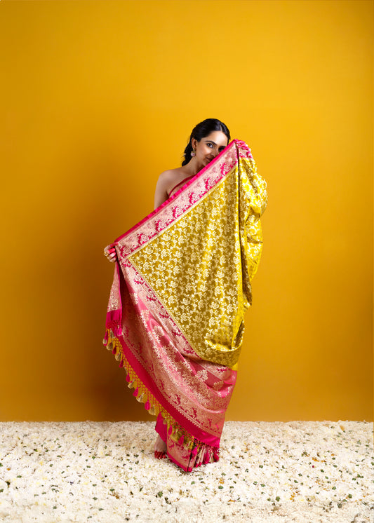 Yellow chiniya silk kurta, kora kadhwa dupatta 3 piece set