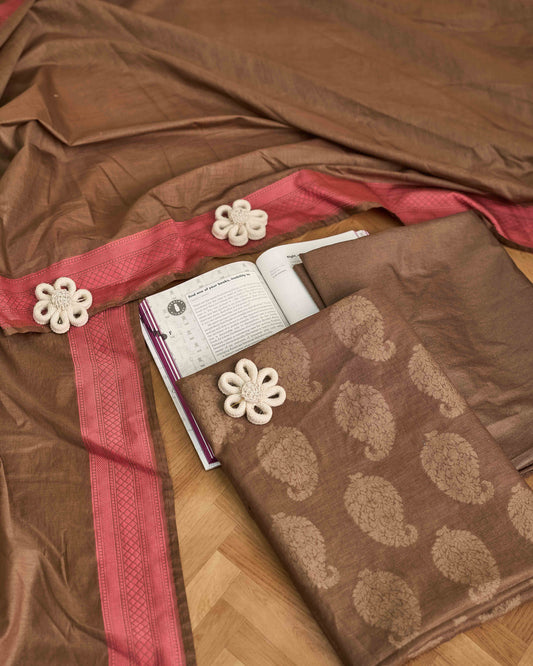 Brown cotton self woven kurta, plain dupatta with pink border, plain bottom