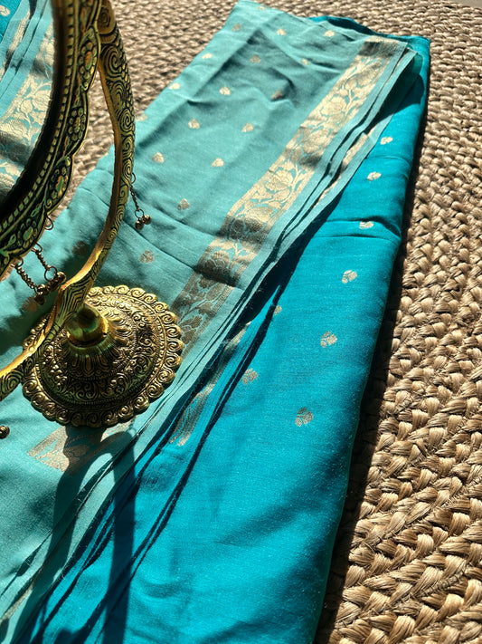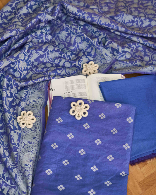 Blue small booti kurta, shikargah dupatta, plain bottom