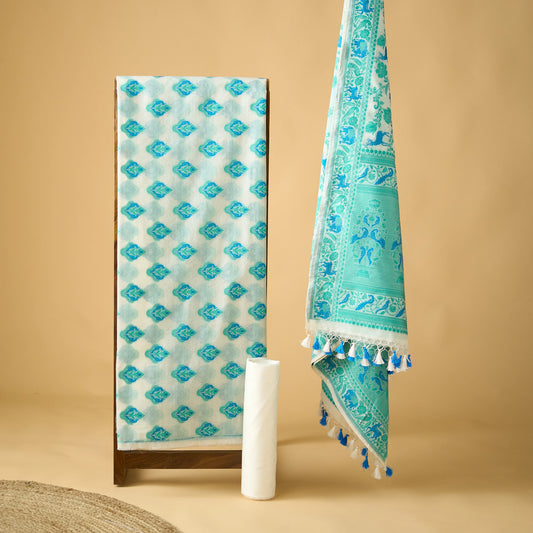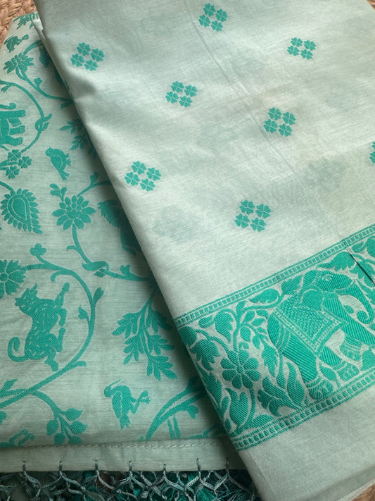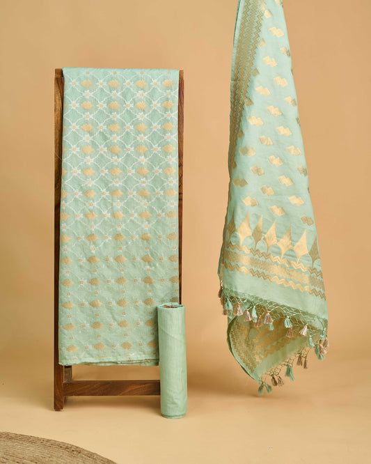 Sea green booti kurta, shikargah dupatta, plain bottom