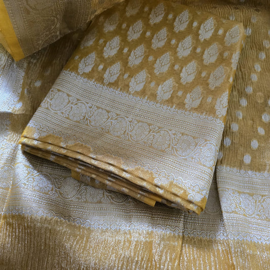 Yellow tissue suit, hand crushed dupatta , plain solid color bottom