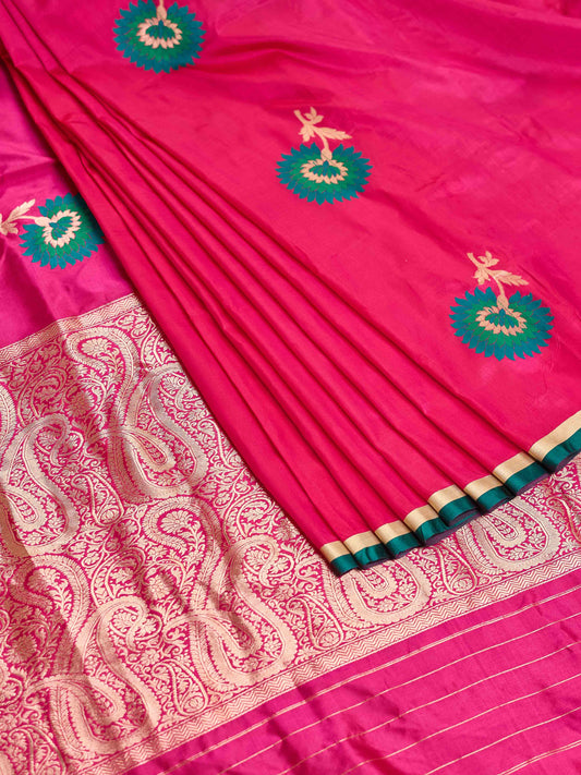 Black chanderi with pink meenadar bootis, jaal dupatta, plain bottom.