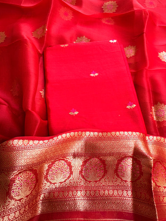 Red Chiniya silk kurta , bottom and kora kadhwa dupatta