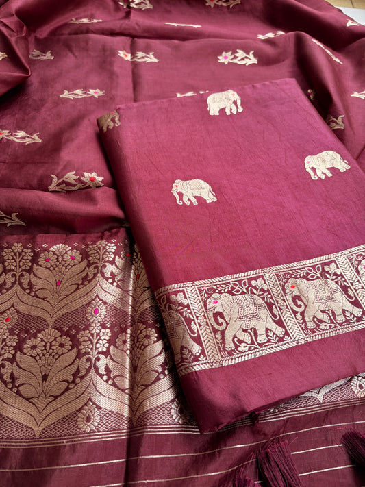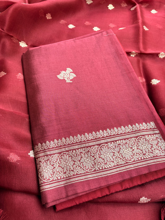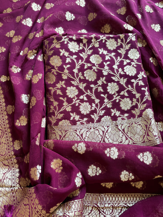 Maroon Chiniya Silk silver zari 3 piece suit set