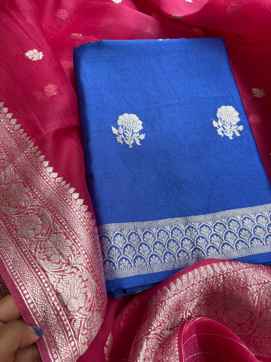Blue Chiniya silk kurta, pink kora kadhwa dupatta, plain bottom