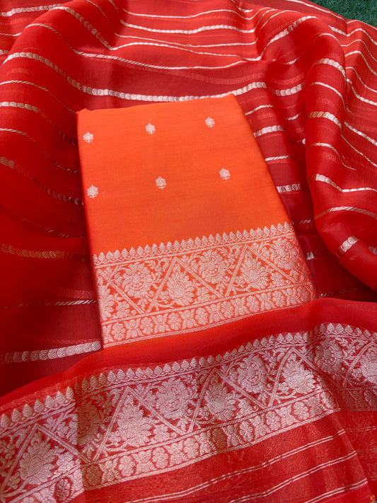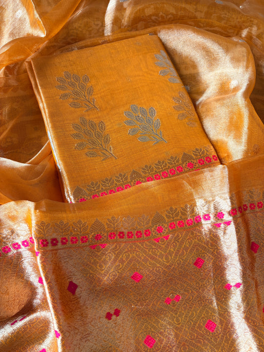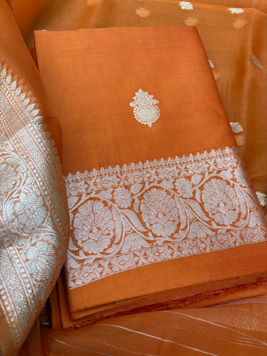 Orange raw artisan silk kurta, bottom, kora dupatta