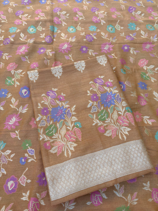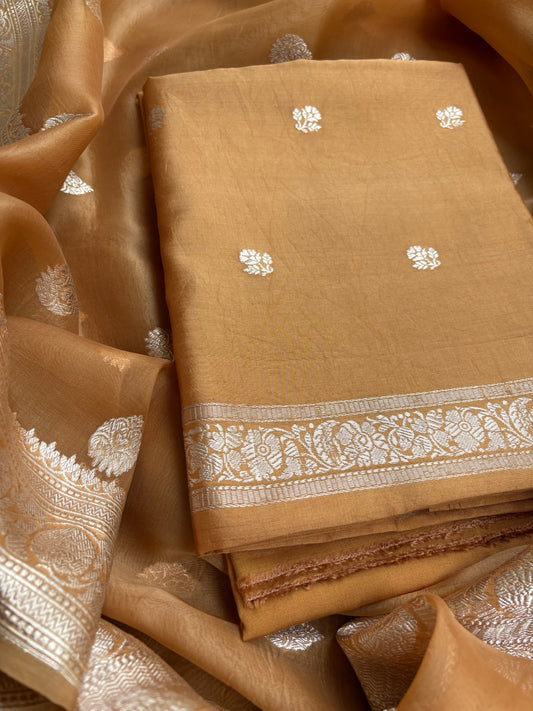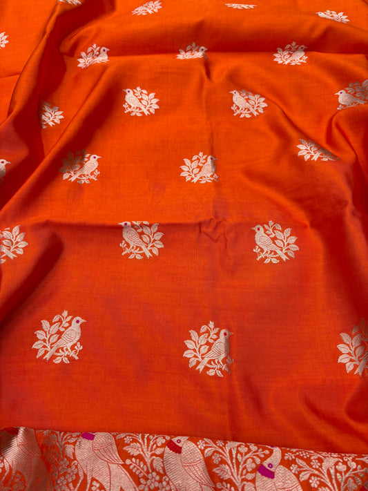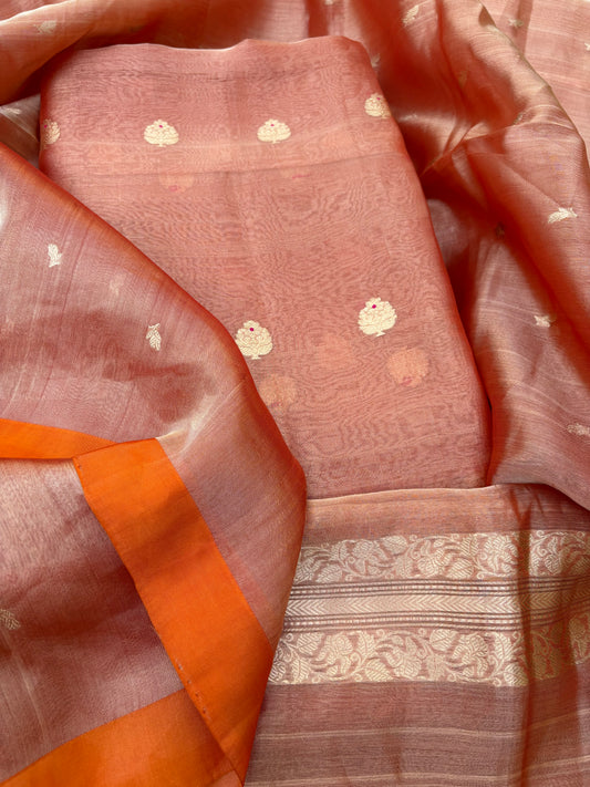 Orange raw silk kurta, bottom , Chiniya kora dupatta light shaded.