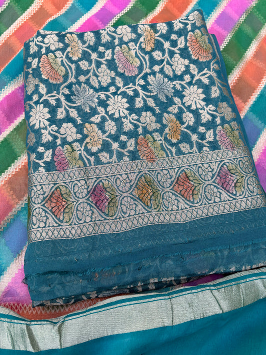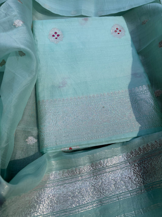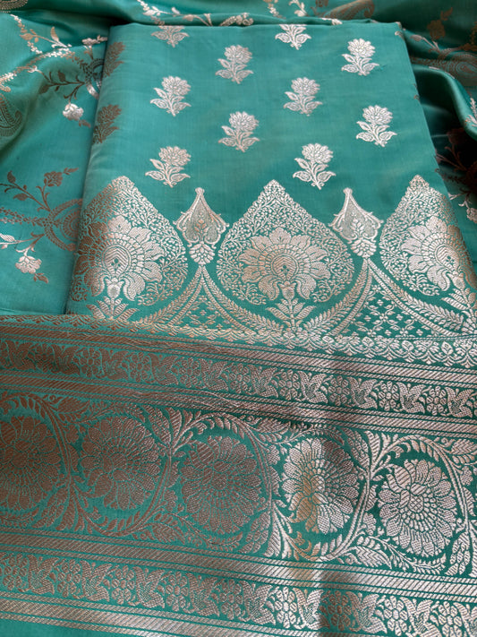 Turq silver zari meenadar kurta, kora silk dupatta, plain bottom