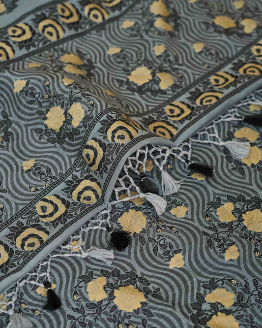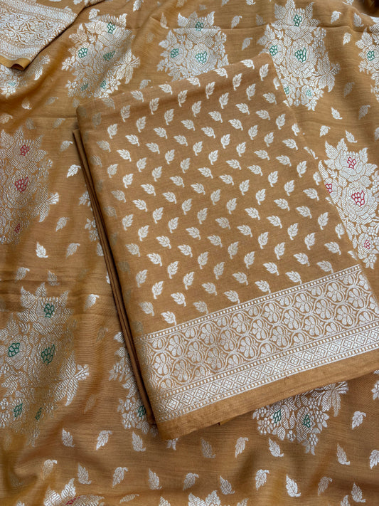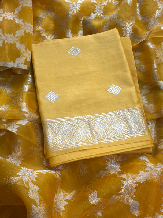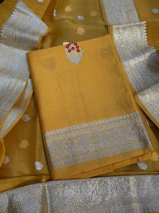 Mustard kora silk kadhwa silver zari 3 piece suit set