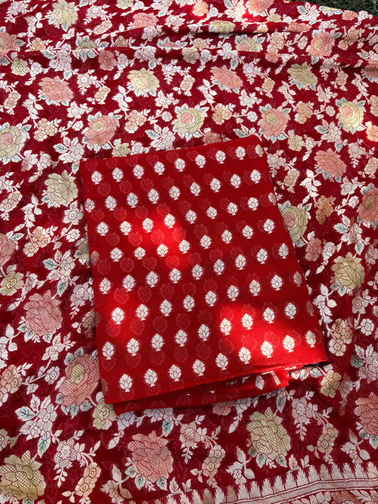 Red Khaddi georgette, hand brushed dupatta, plain bottom