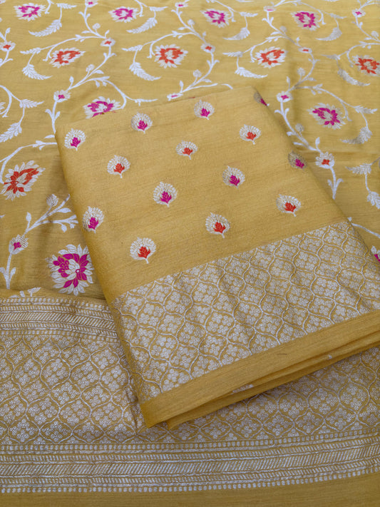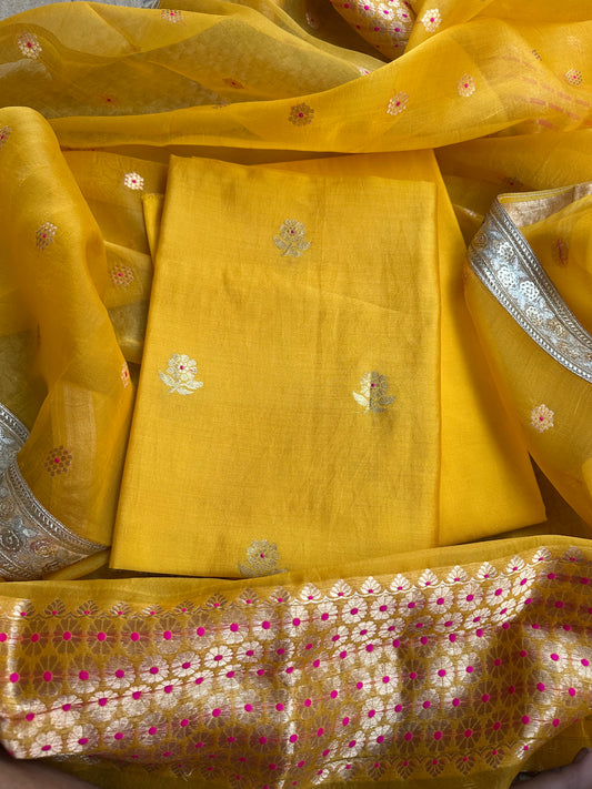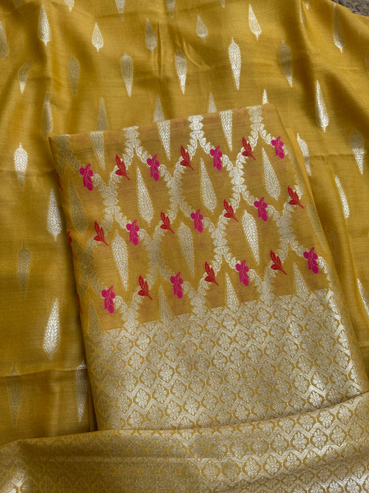 Yellow chiniya silk kadhwa weave , kora silk dupatta, plain silk bottom