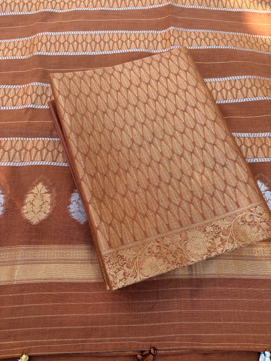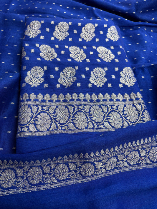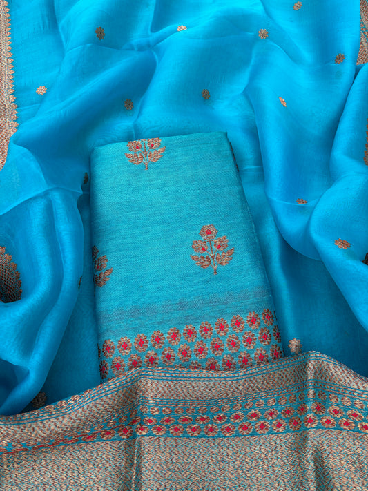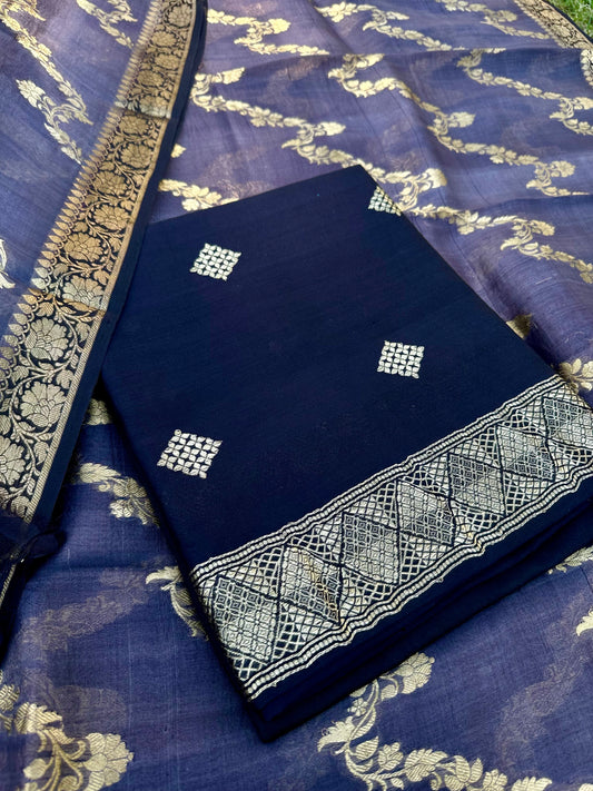 Warm blue raw silk tussar kadhwa suit, kora silk dupatta