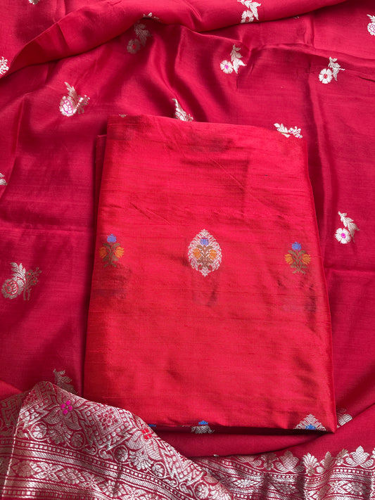 Red raw silk meenadar kurta, chiniya silk dupatta, plain raw silk bottom.