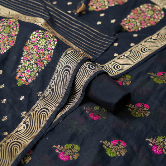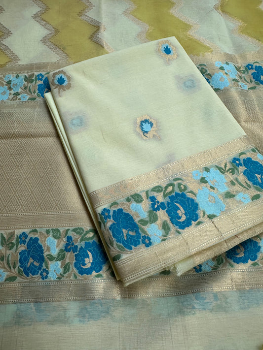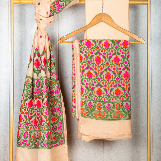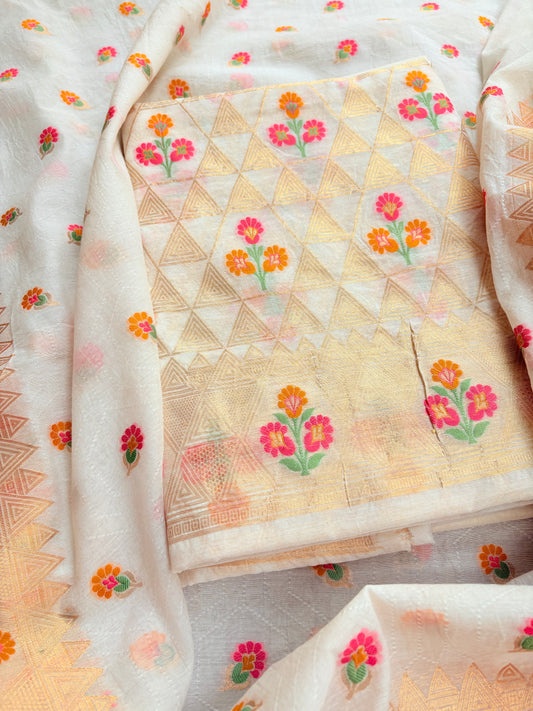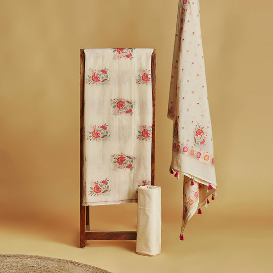 Cream Multicolored Handwoven Flower Chanderi Cotton Suit Set