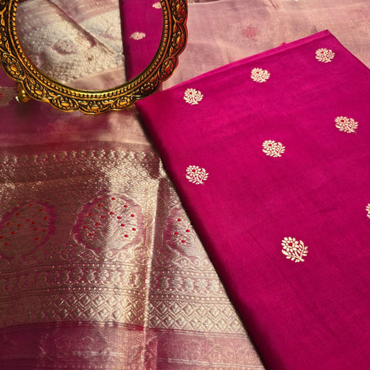 Pink chiniya katan silk kurta, tissue meendar dupatta and plain bottom