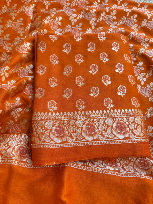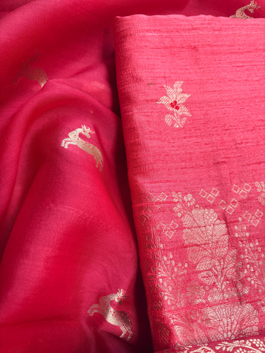 Orange raw silk meendar kurta, pink kora silk dupatta, plain raw silk bottom