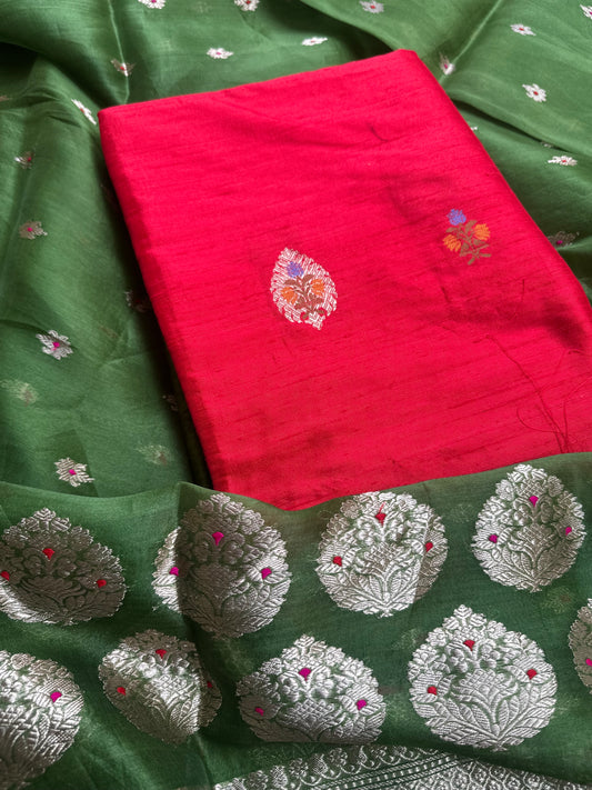 Red raw silk kurta, green kora silk dupatta, plain raw silk bottom