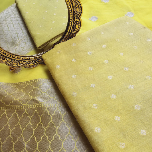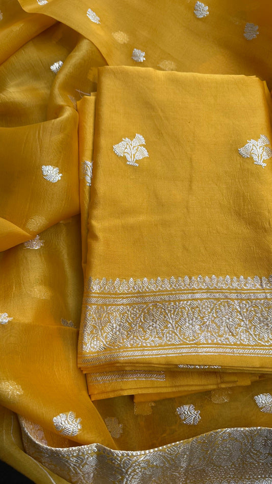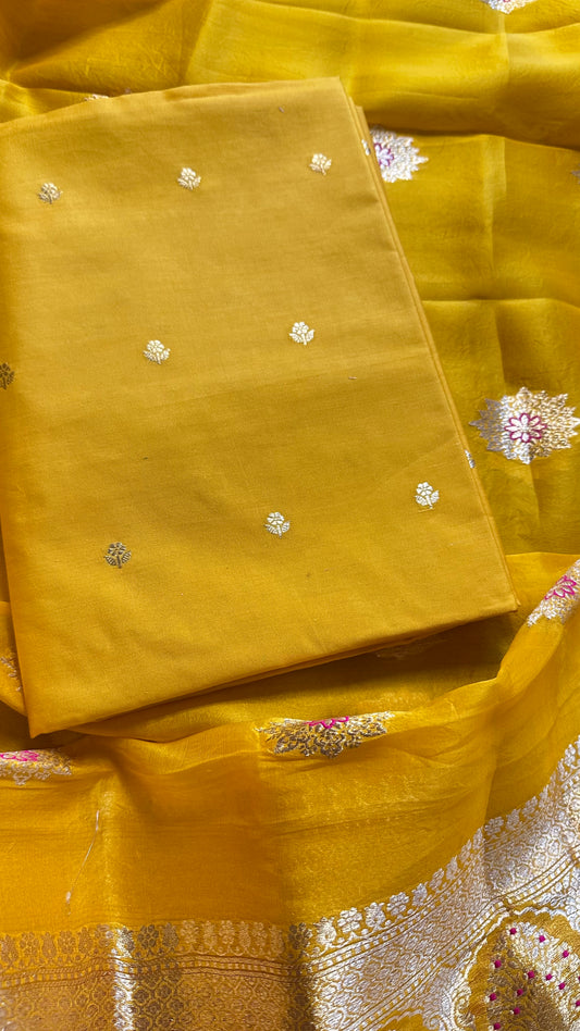 Yellow chiniya silk kurta, kora meendar dupatta, plain silk bottom