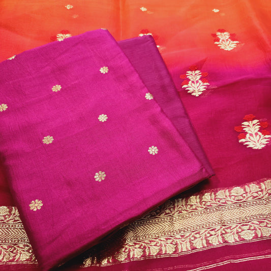Pink chiniya silk kadhwa kurta, plain bottom and kora shaded dupatta