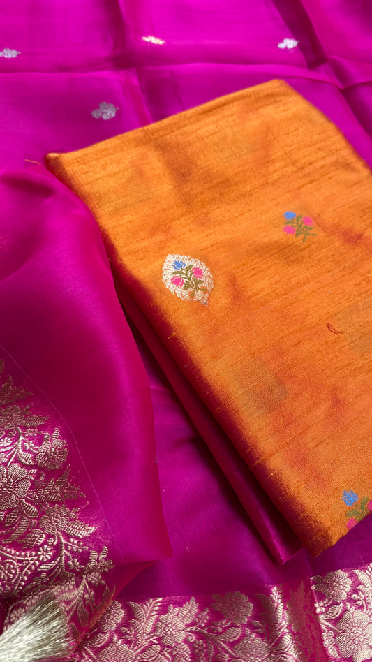 Orange raw silk meendar kurta, pink kora silk dupatta, plain raw silk bottom