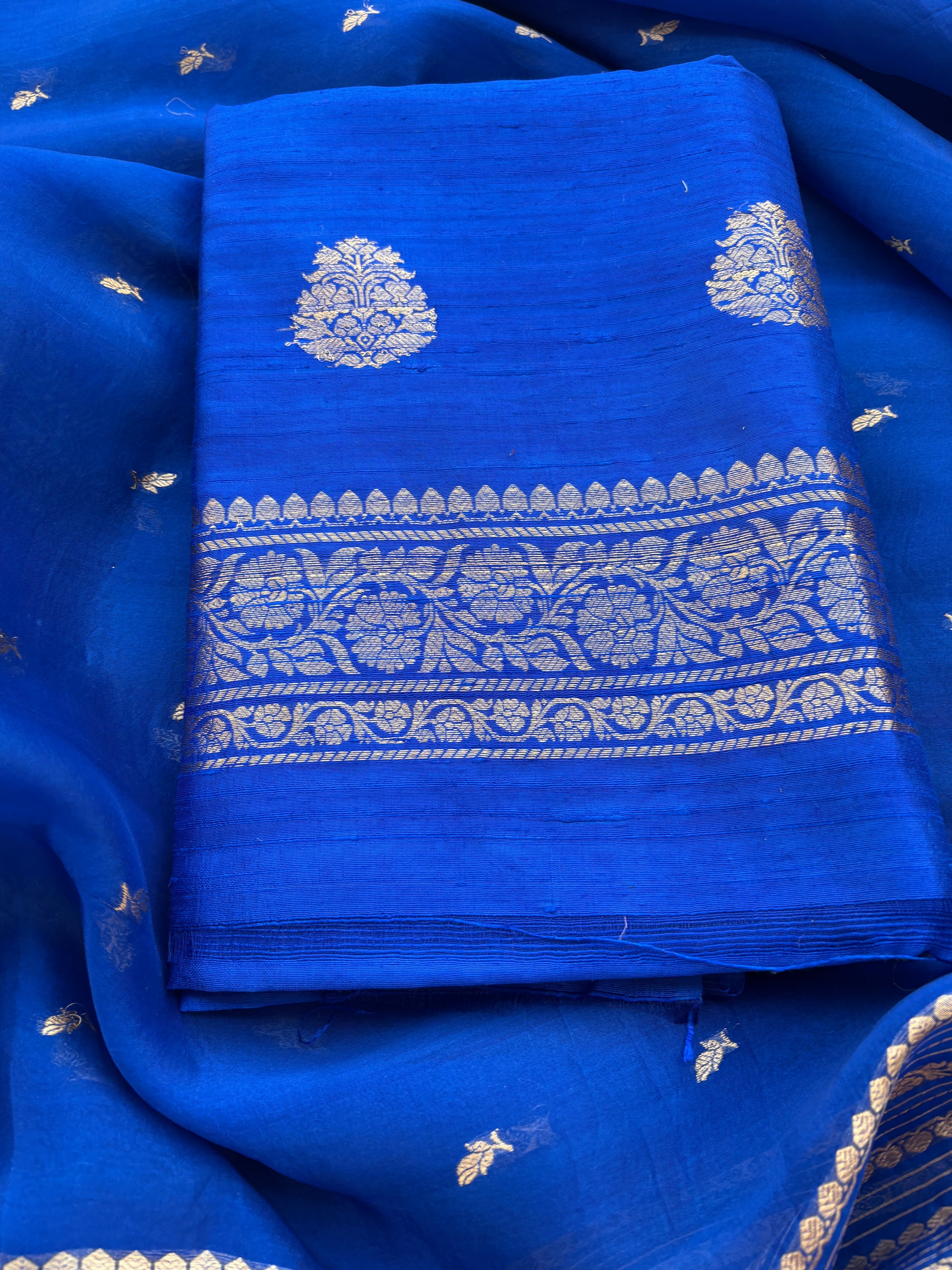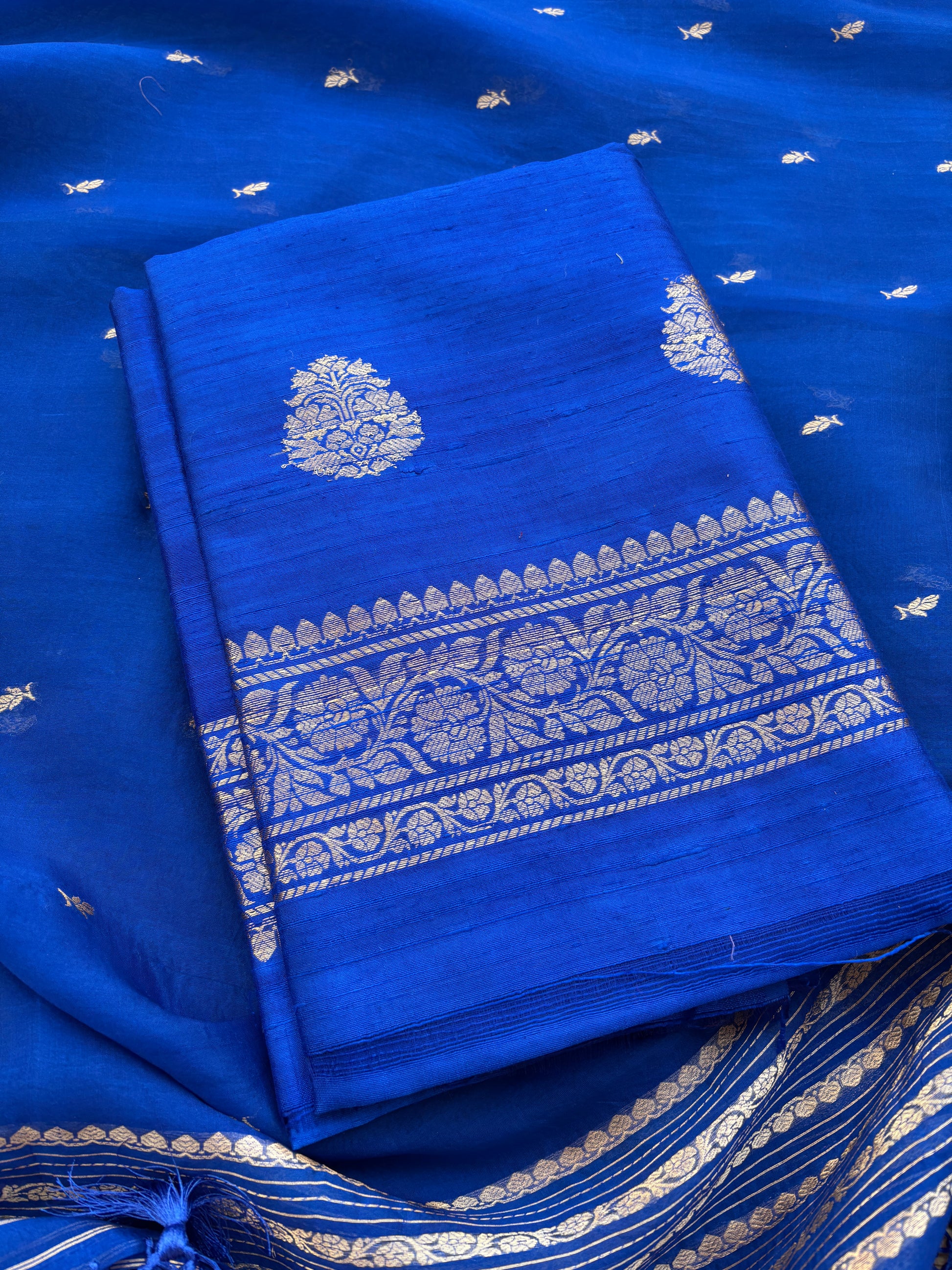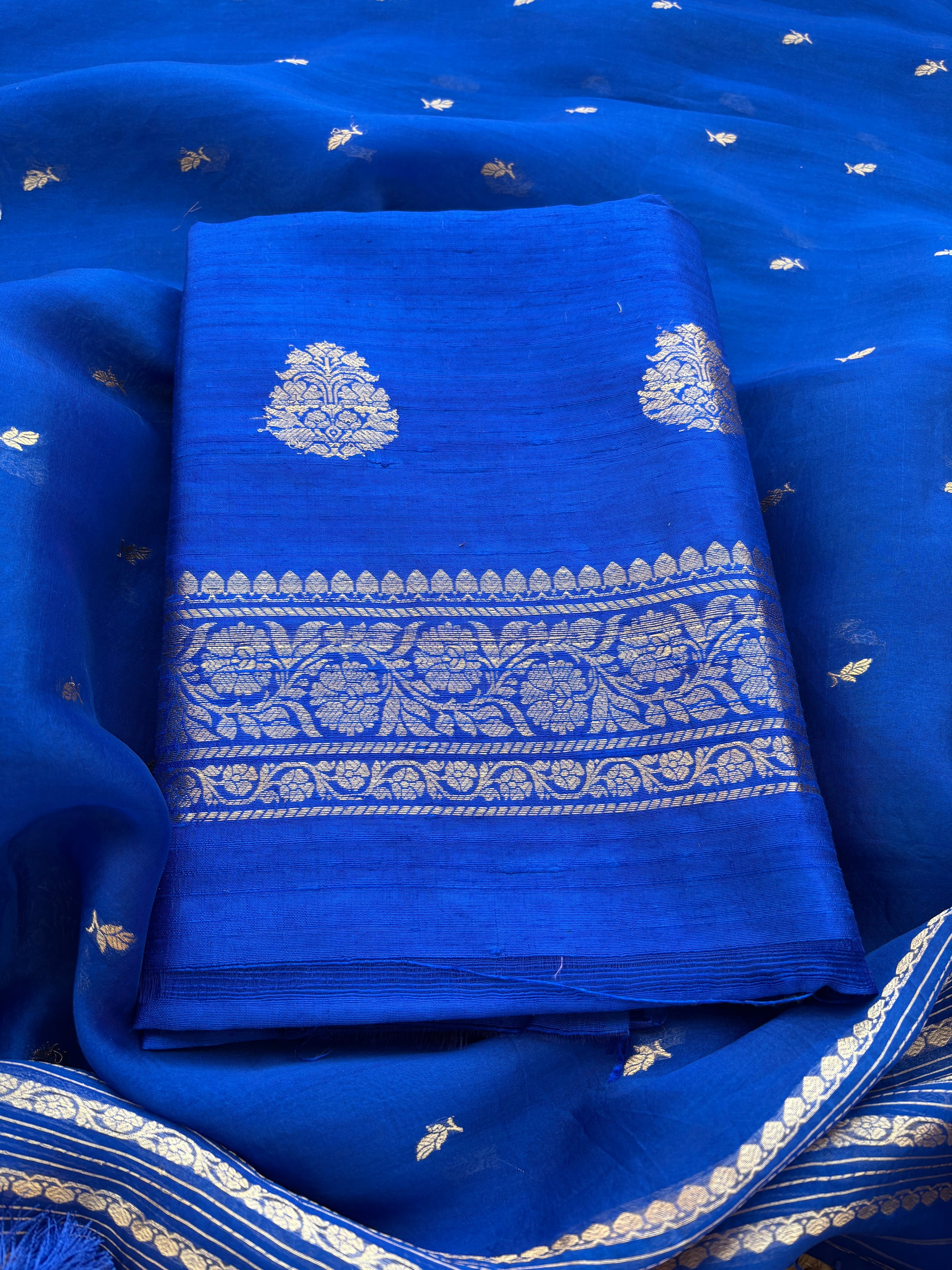 Blue raw silk suit set with kora silk dupatta
