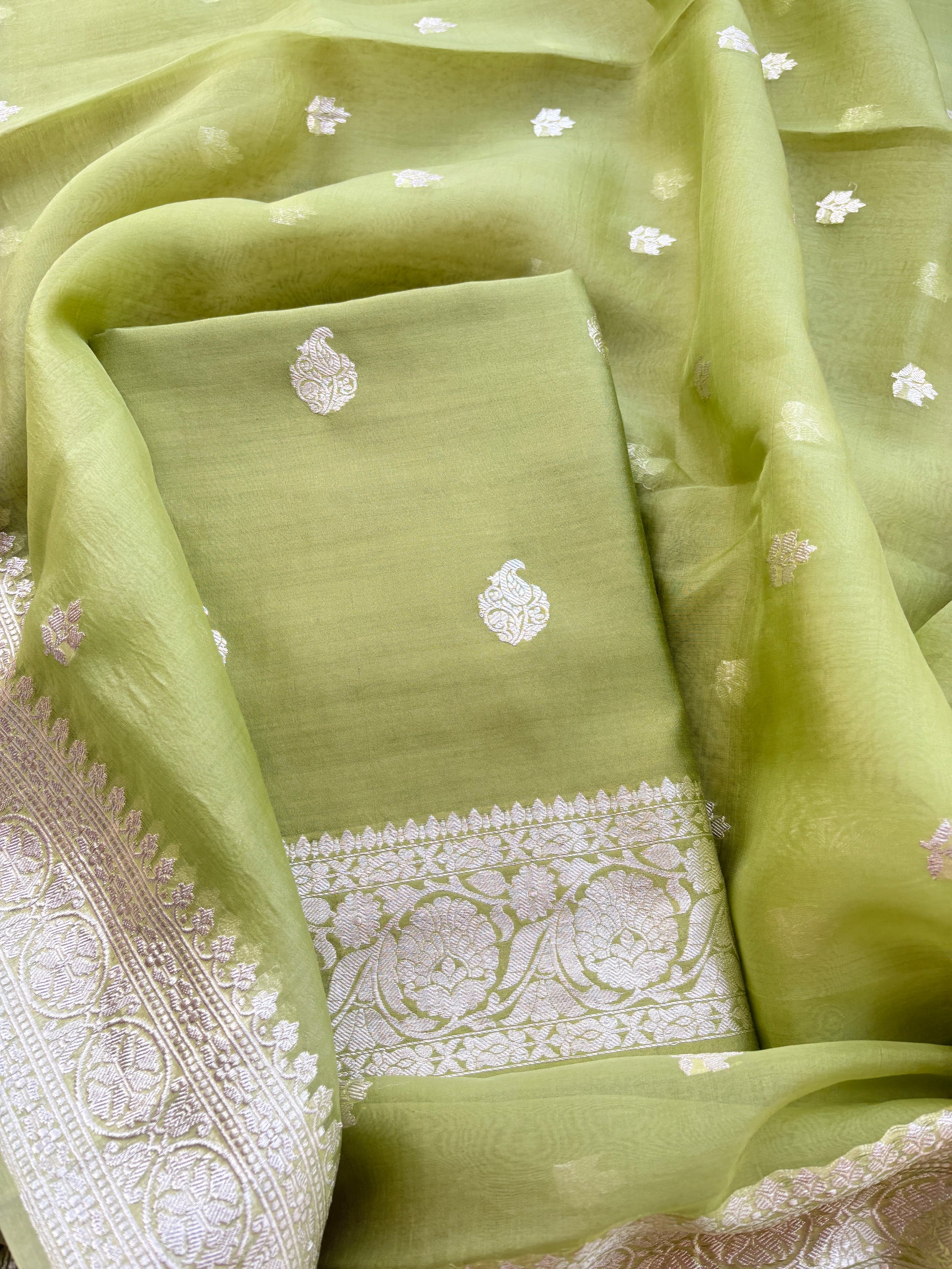 Green Chiniya silk pure silver zari suit set