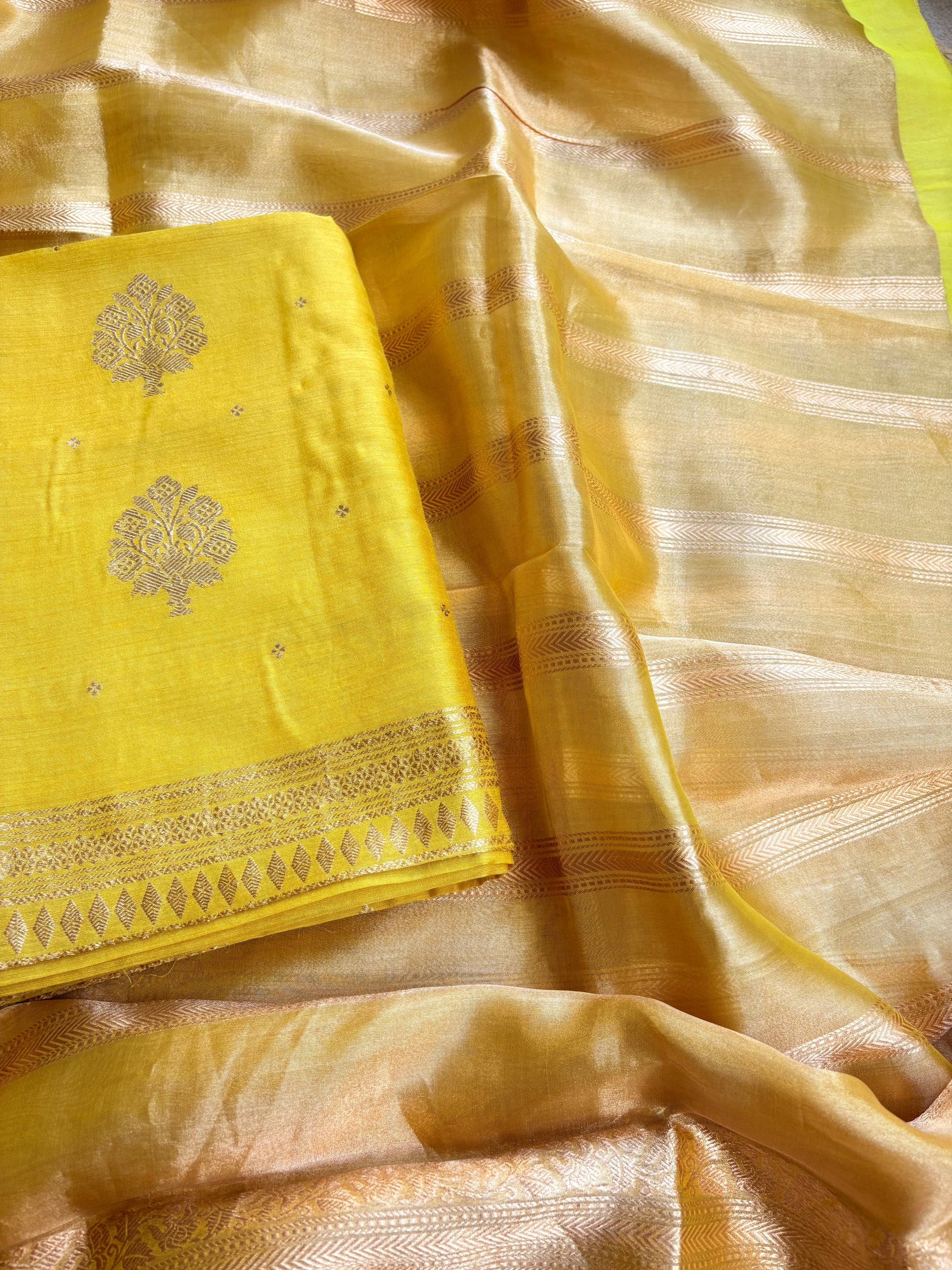 Lime yellow moonga silk kurta, bottom and tissue kadhwa dupatta