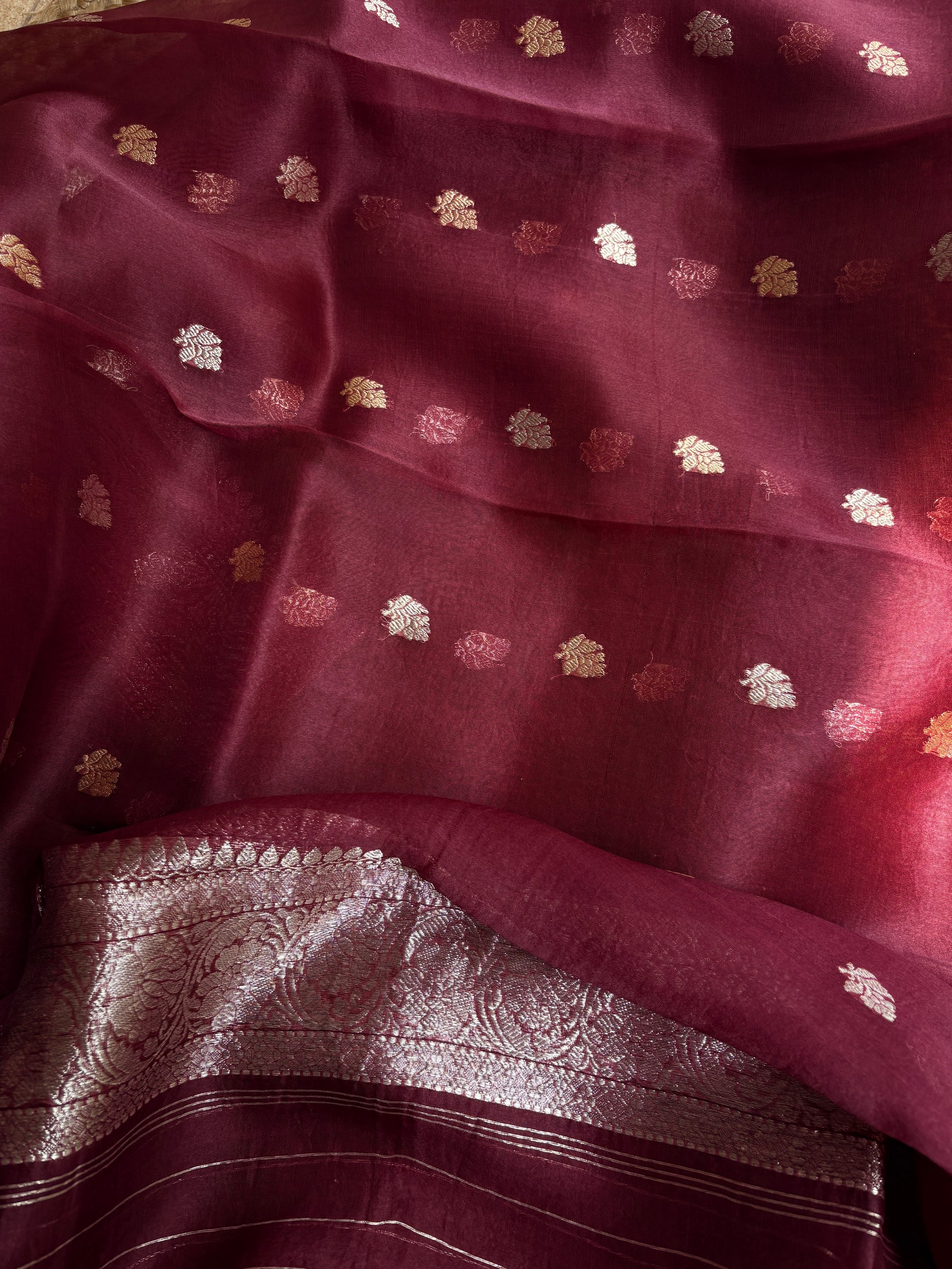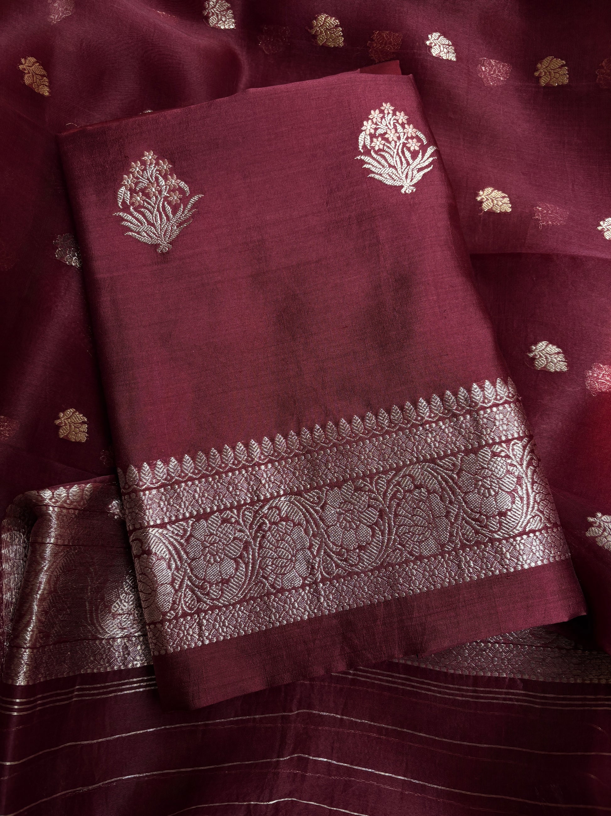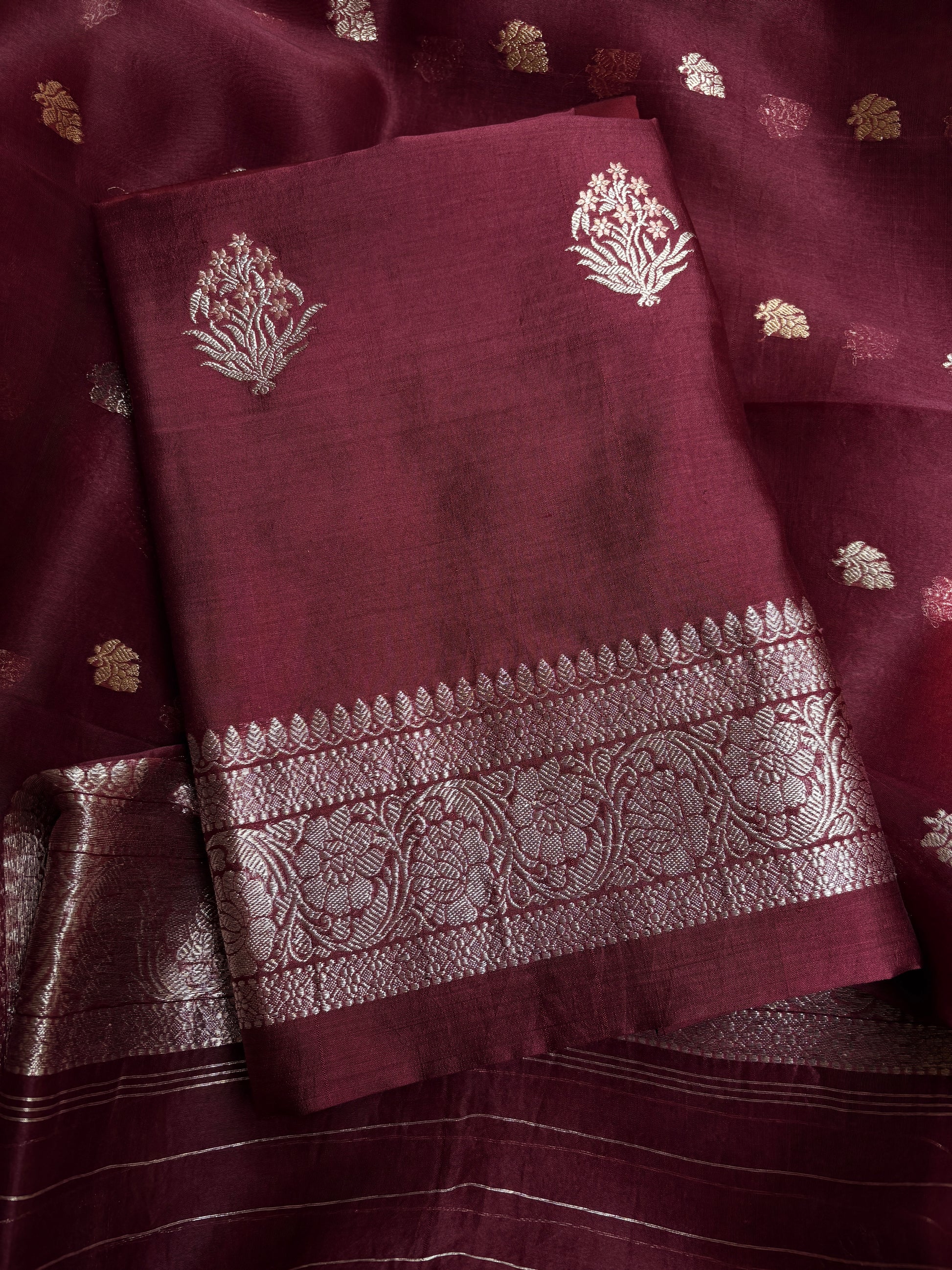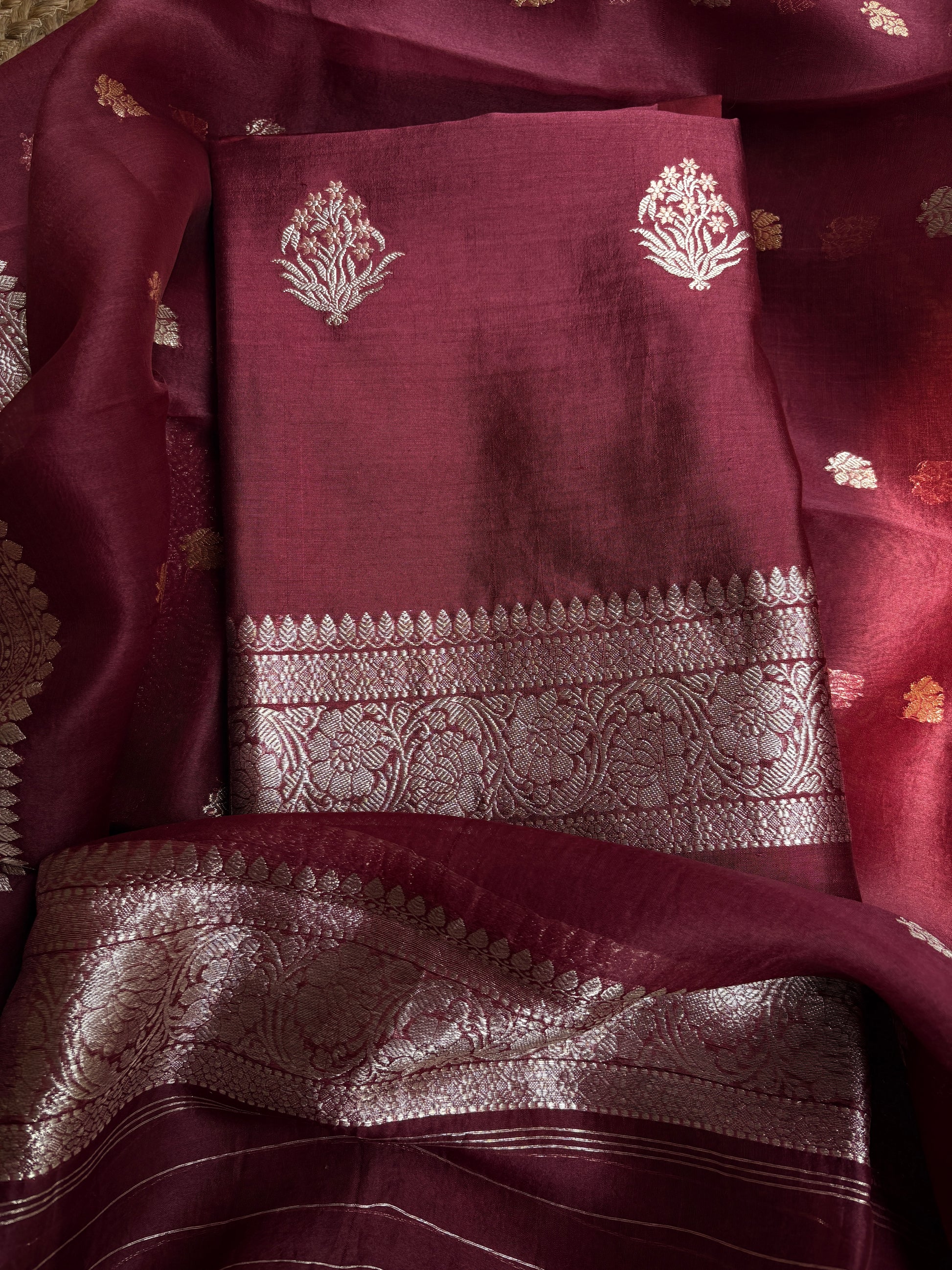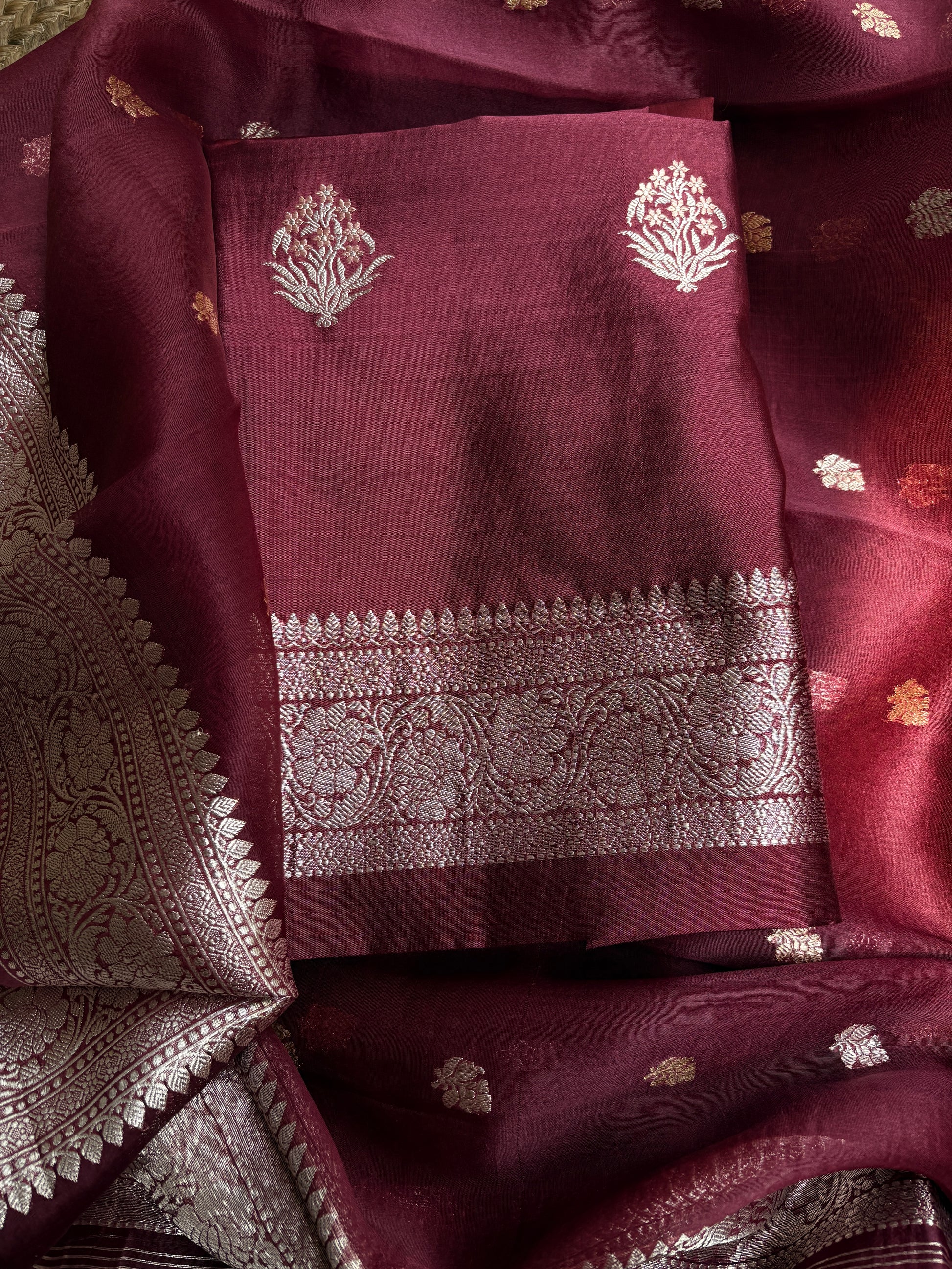 Maroon chiniya silver zari kadhwa kurta, kora silver zari dupatta, plain bottom