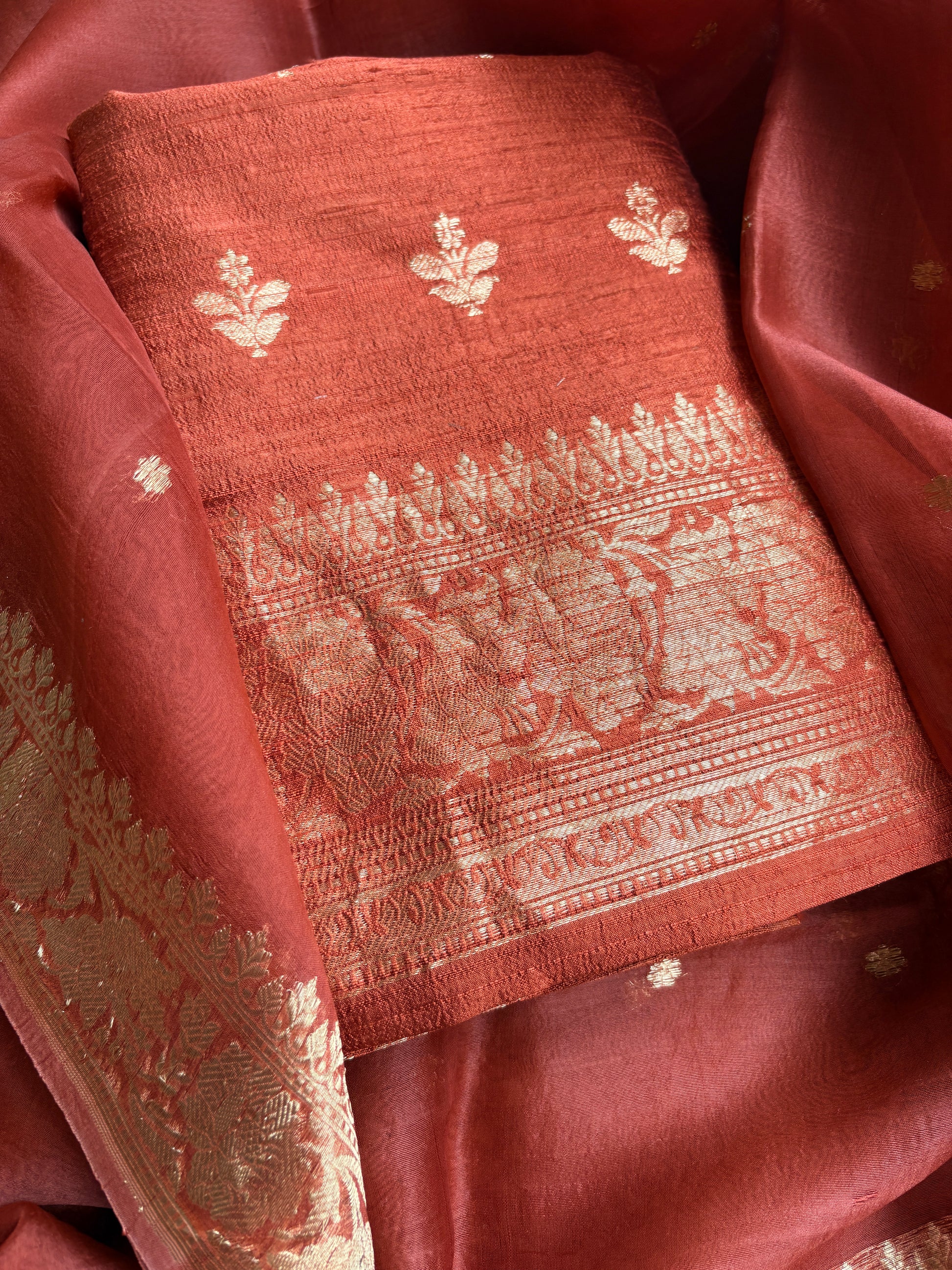 Rust raw silk kurta, bottom and kora kadhwa dupatta