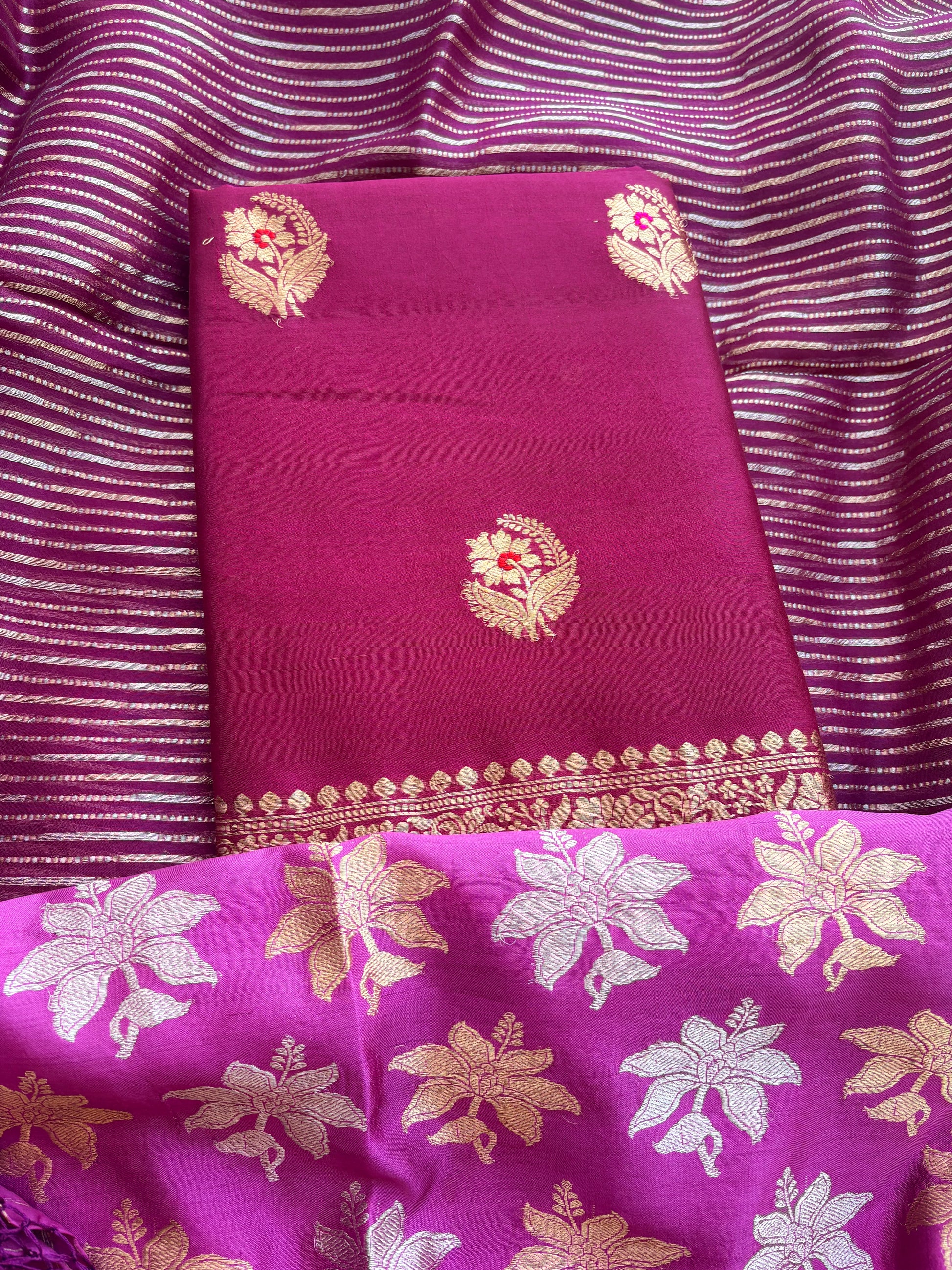 Wine Chiniya silk with stripes Sona rupa dupatta