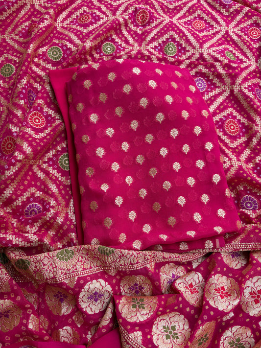 Pink Khaddi georgette kurta, bandhani georgette dupatta, plain bottom